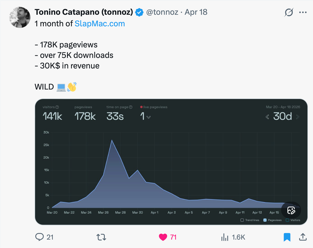 This guy made a MacOs app that makes noises when you slap your Mac. It's now made $30k in the first month. He also got interviewed for a US radio show that reach 6.5 million listeners. Wild.