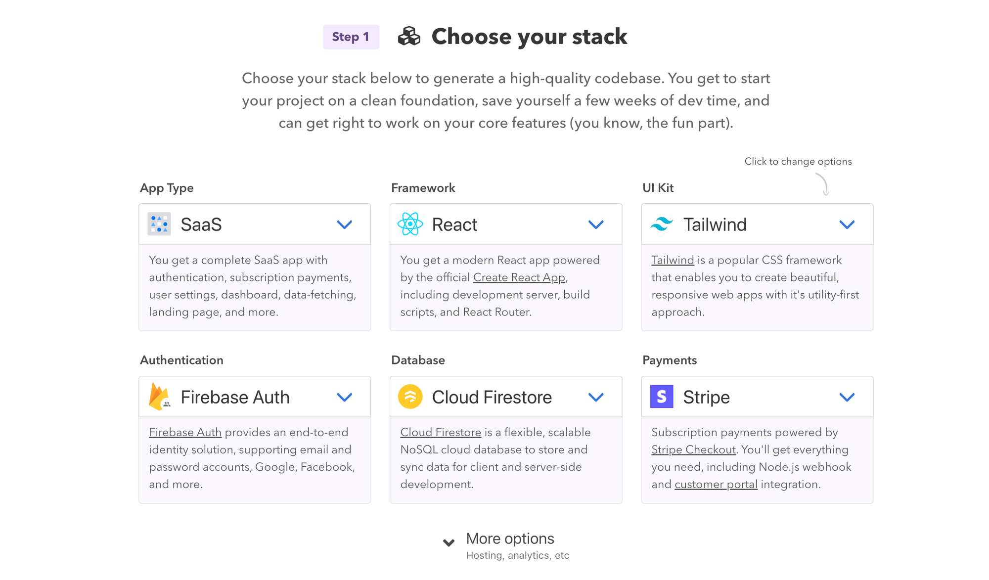 Divjoy is a React SaaS boilerplate, although it also offers options for using NextJS as well. I like the fact there is a lot of optionality here. You can choose from a variety of UI libraries like Tailwind, Bulma, Bootstrap and Material UI. For hosting you can choose between Vercel or Netlify.