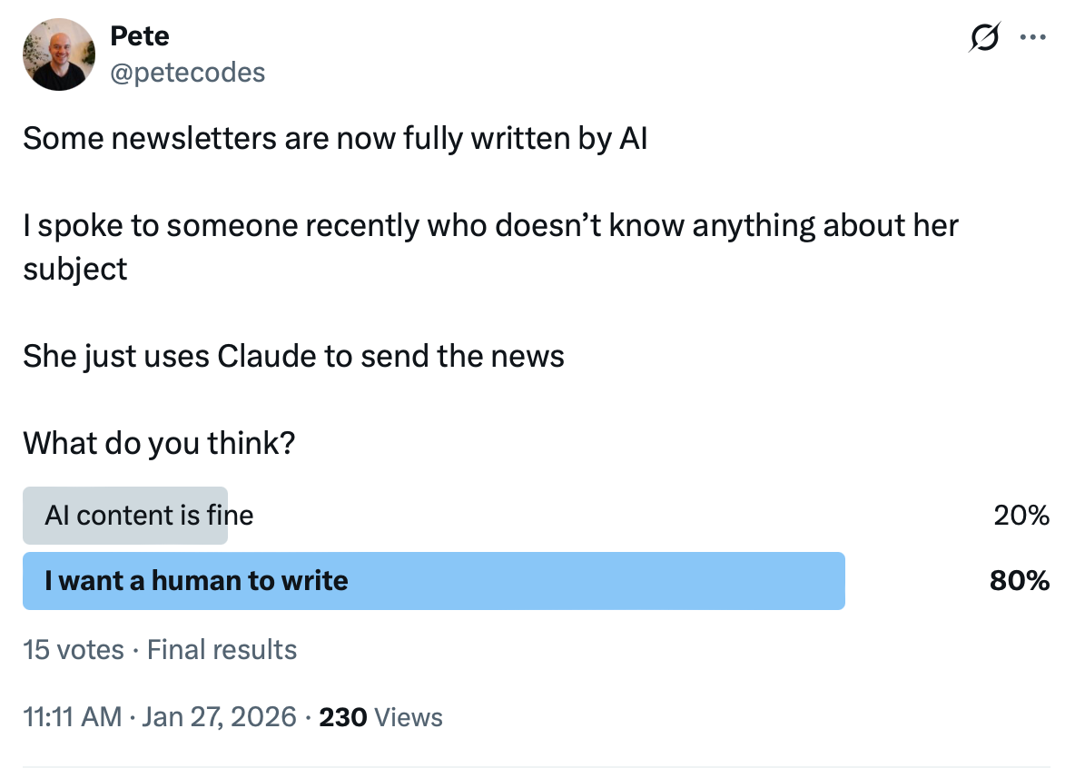 I asked people yesterday what they thought of newsletters written by AI instead of a human. Admittedly, it's a small sample size but 80% of people on my poll said they wanted someone to actually write it.