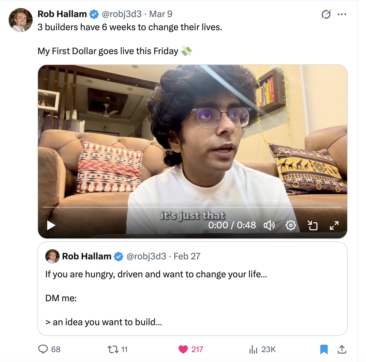 He's filming 3 founders who are trying to earn their first dollar online with a vibe coded startup. It's starting on Rob's YouTube channel today. I really don't know why no-one has done this before!