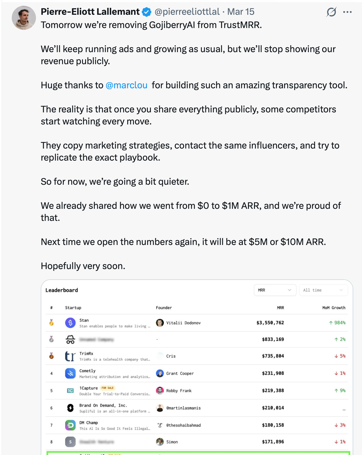 Gojiberry reached $1m ARR recently. Now they are pulling their profile from TrustMRR, a website where founders can share their companies and metrics.